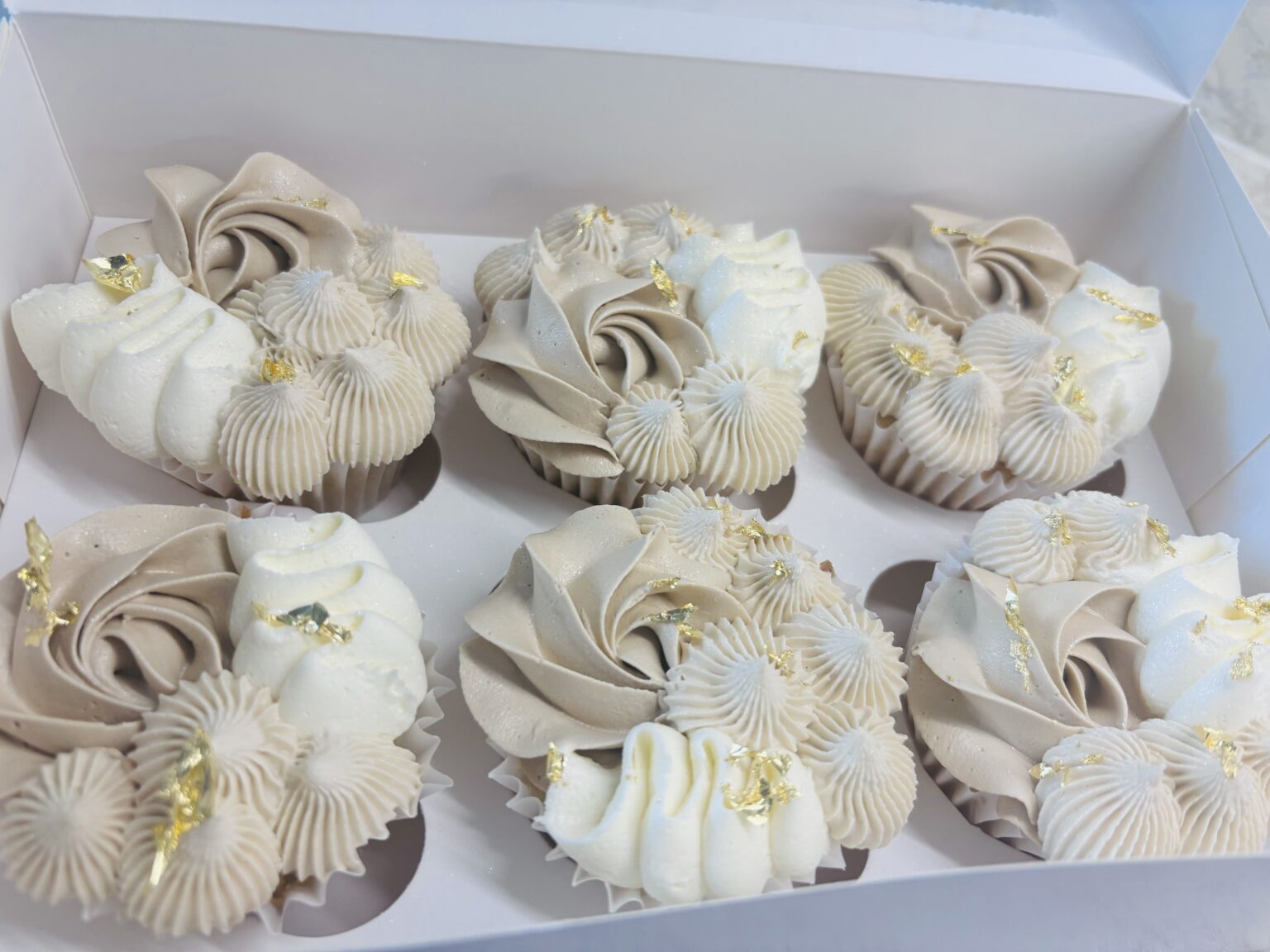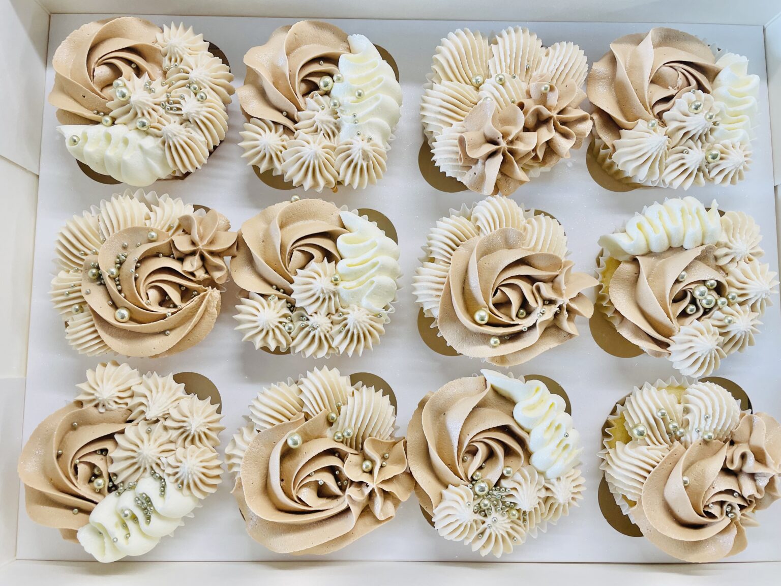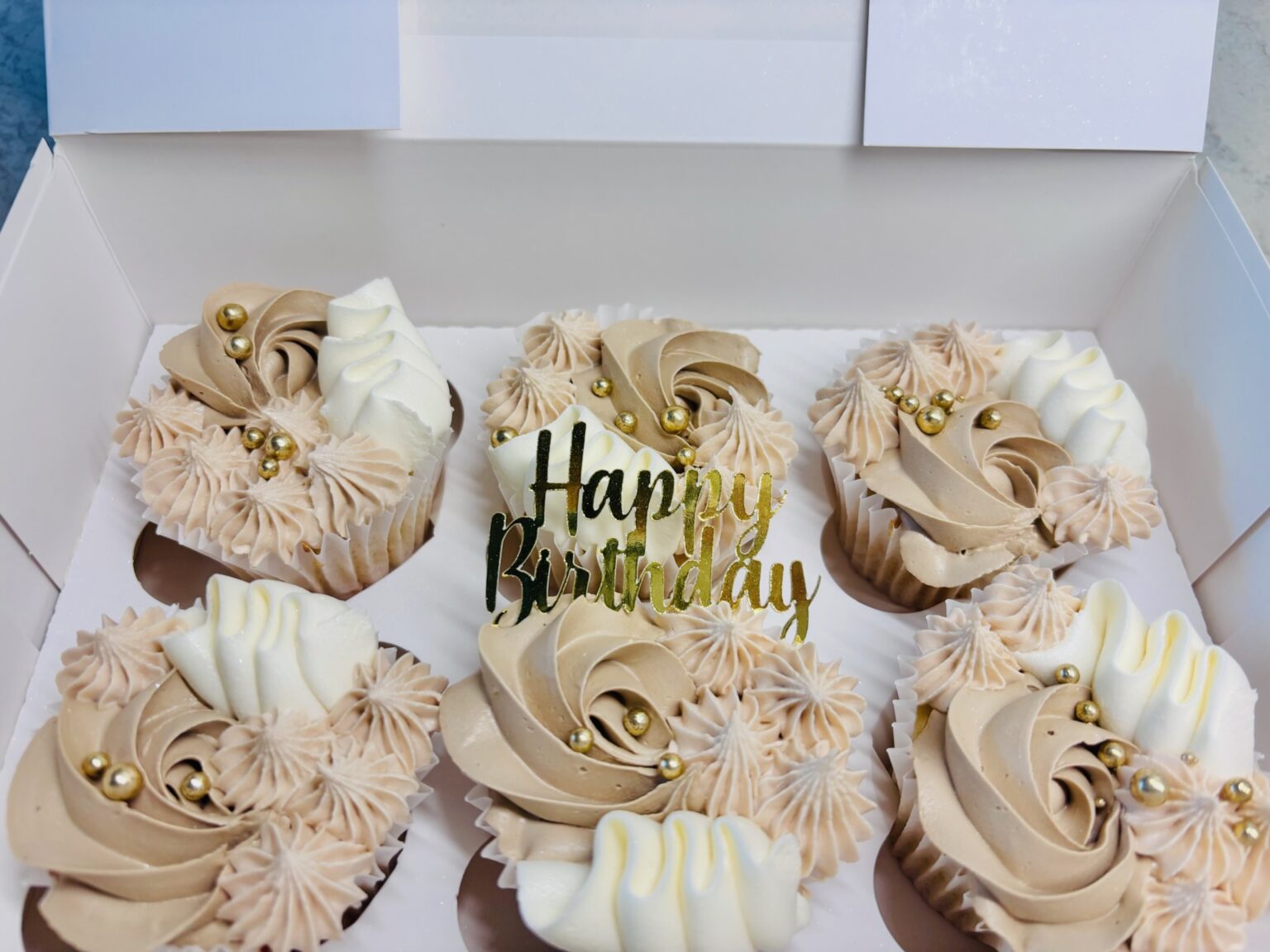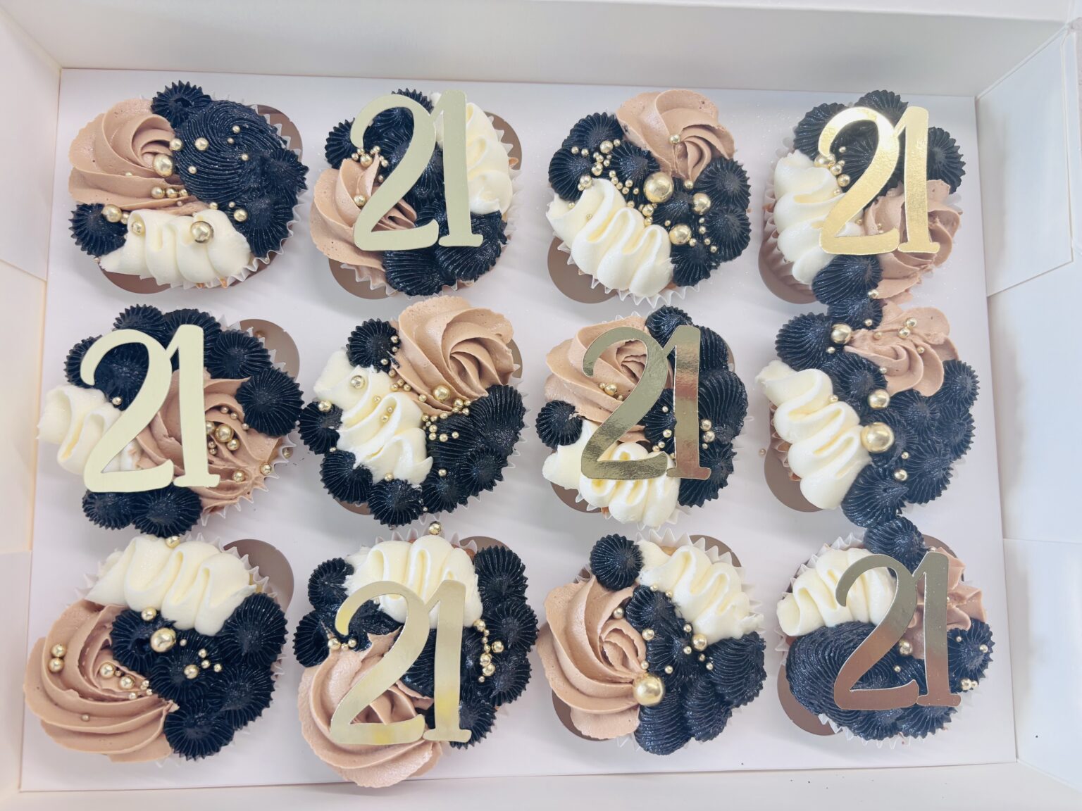 A box of elegant vanilla cupcakes decorated with swirls of cream, black and caramel-toned buttercream. Each cupcake is topped with gold sugar pearls, and a gold “21” topper, creating a sophisticated black, gold, and neutral colour palette. Perfect for those milestone birthdays! Change the age below.