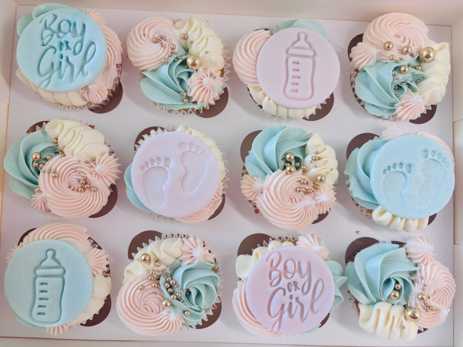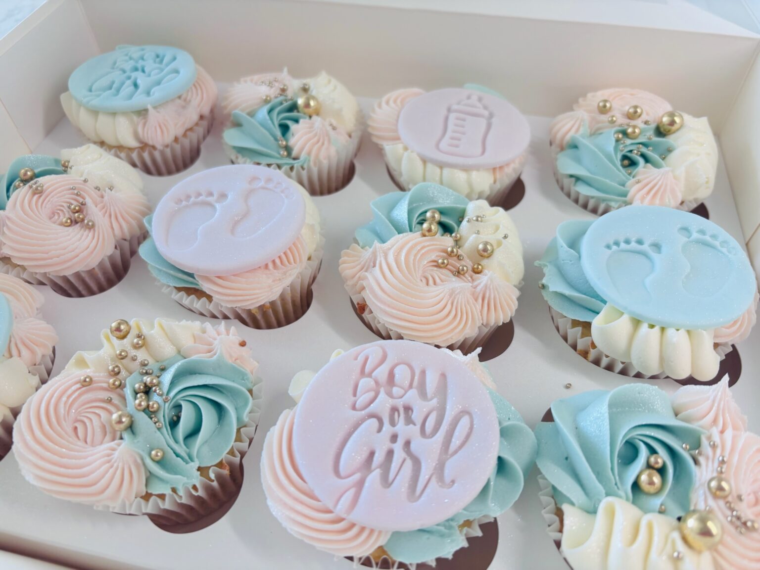 Celebrate the big reveal with this adorable box of twelve cupcakes, specially designed for gender reveal parties. Each cupcake is decorated with a mix of baby pink and blue piping and edible baby-themed toppers, and a surprise filling inside reveals the baby’s gender. Perfect for sharing with friends and family, these cupcakes add a fun, […]