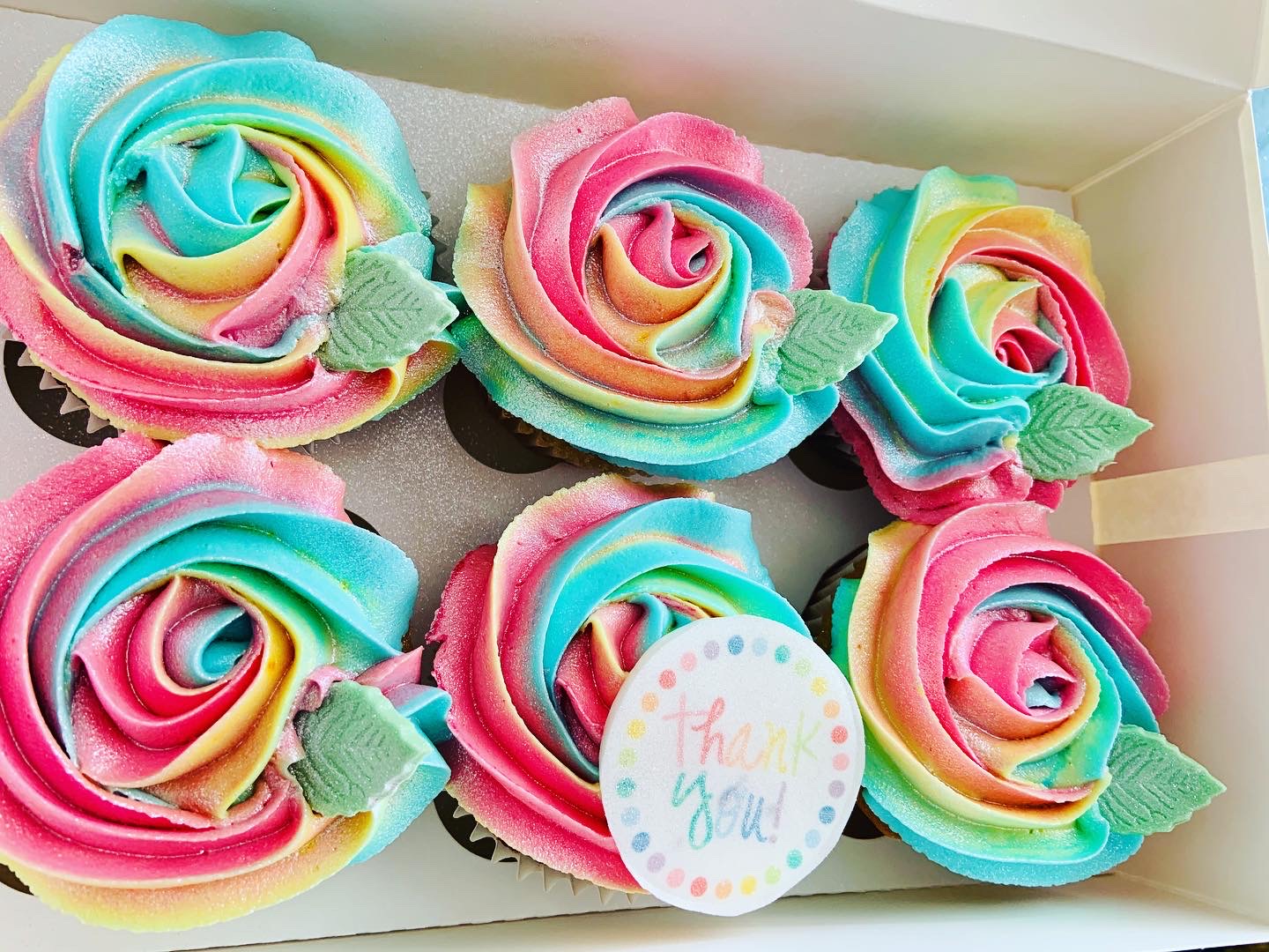 A delightful box of six vanilla cupcakes, each beautifully decorated rainbow buttercream. Select from “Thank you” edible image or “Happy Birthday” topper
