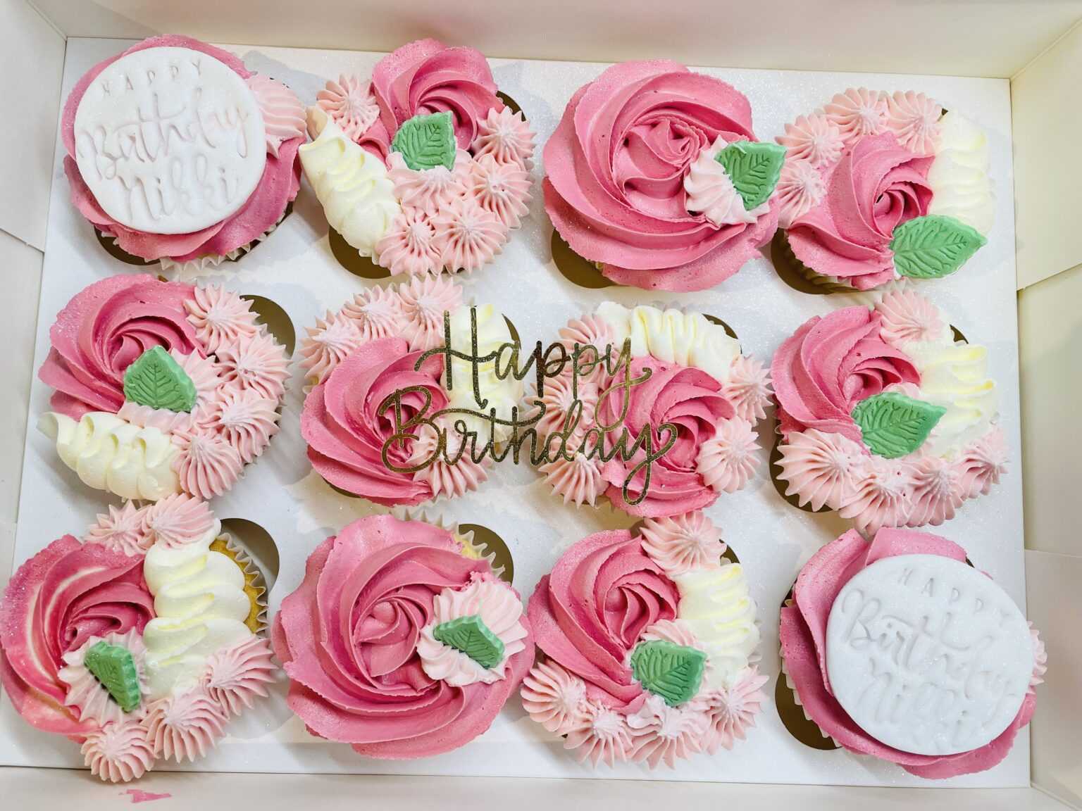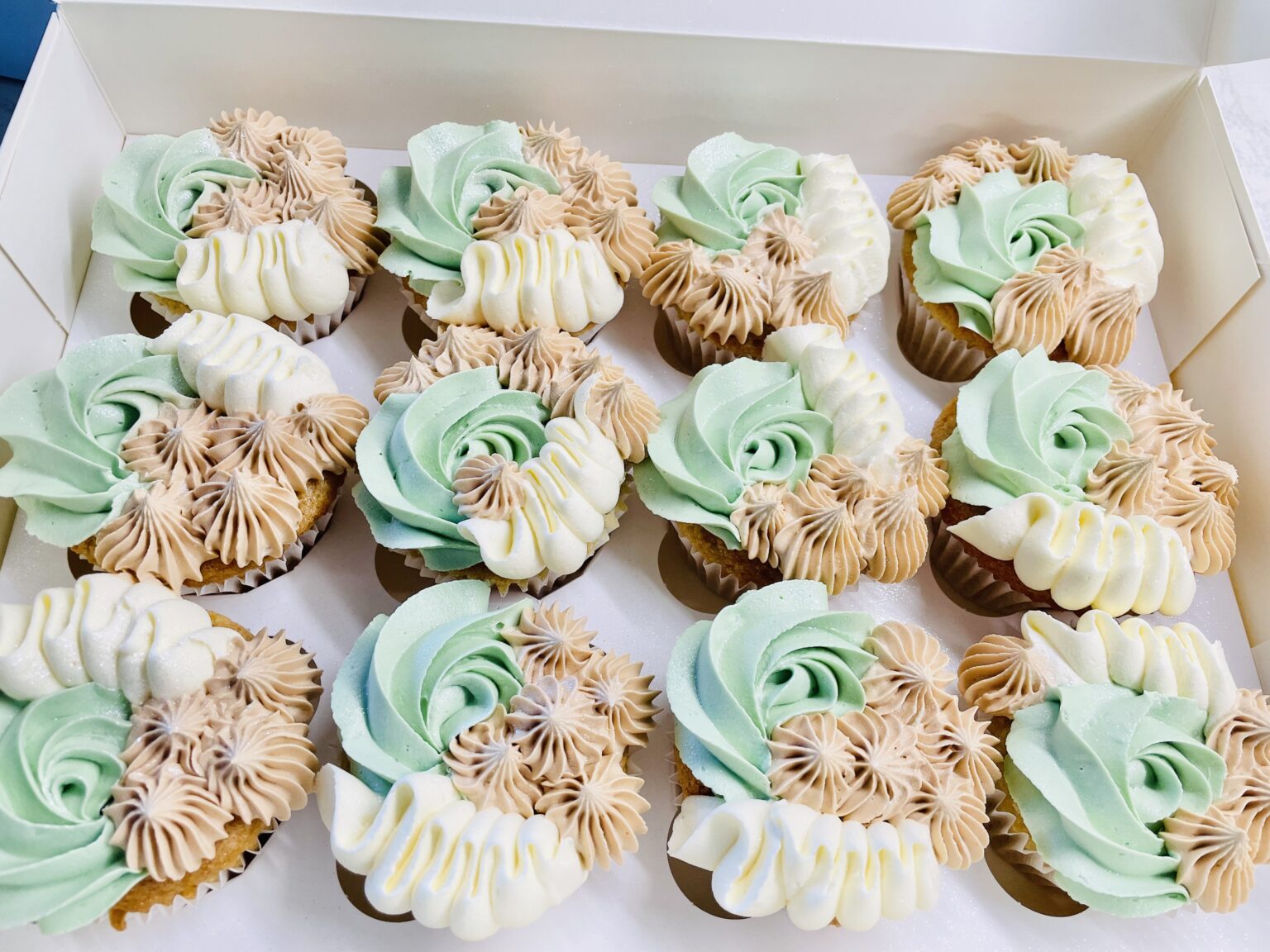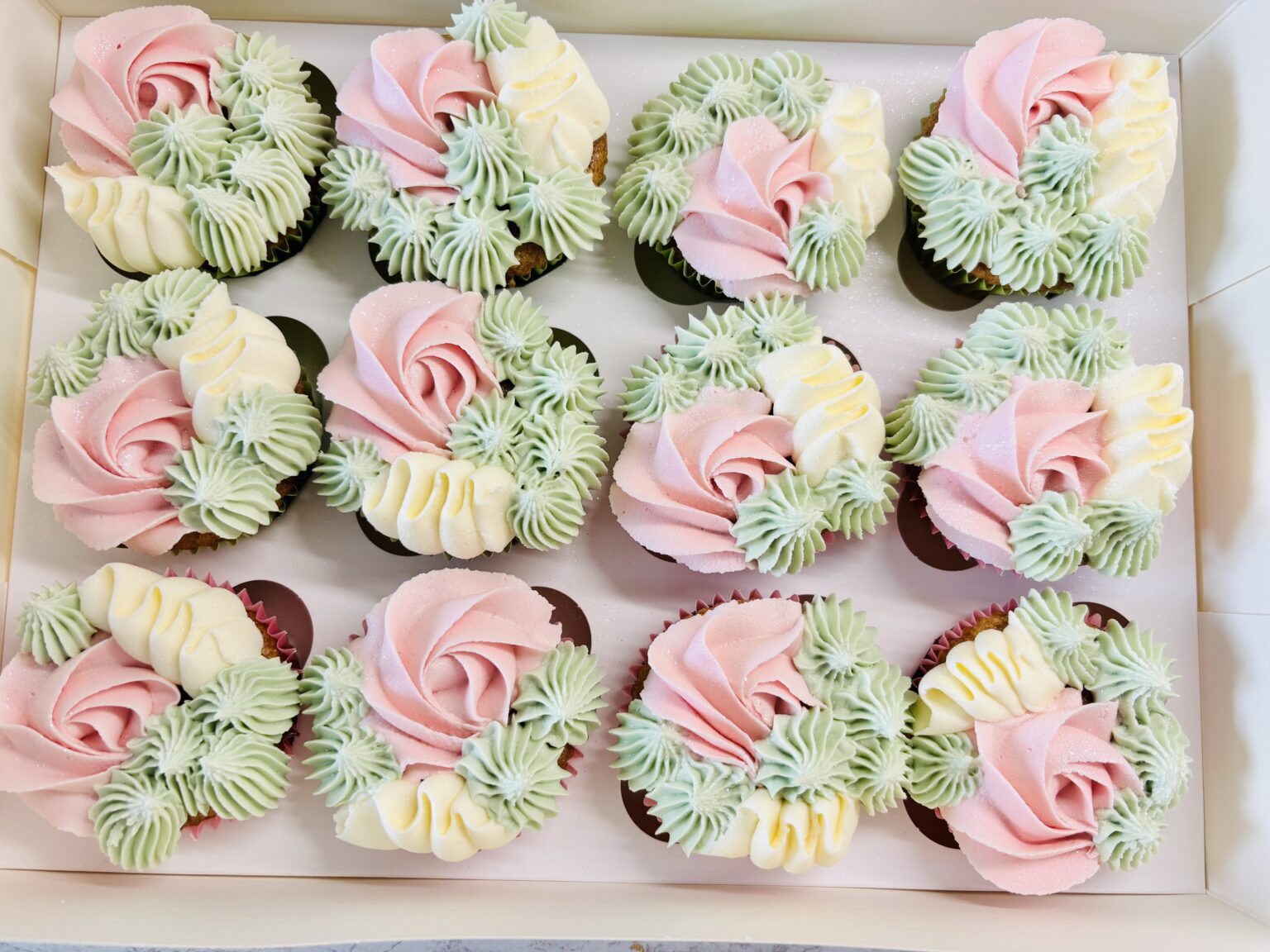 A delightful box of twelve vanilla cupcakes, each beautifully decorated with three different piping styles for a fun and elegant variety. Perfect for sharing, gifting, or treating yourself to a sweet indulgence. Select shade of a colour paired with cream buttercream, or select other and specify the 2 colours you would like at checkout.