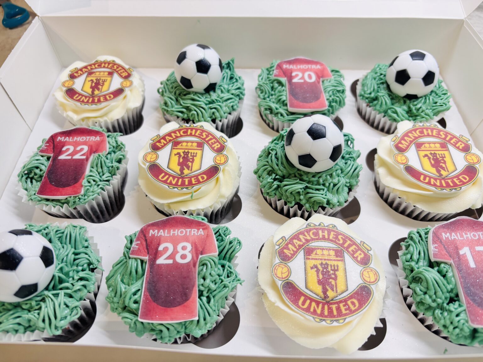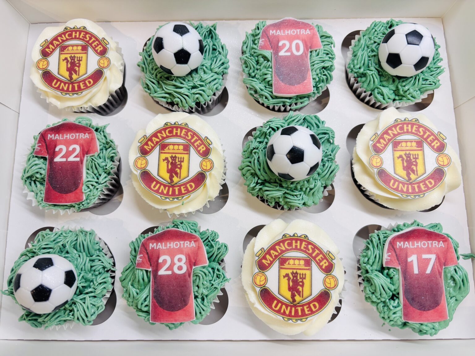 A box of vanilla football-themed cupcakes decorated in green buttercream to resemble grass, each topped with your favourite teams logo and shirts (edible), and non edible mini footballs. Perfect for the football fan in your life! Please provide the football team and shirt numbers/names you would like at checkout, we would not be able to […]