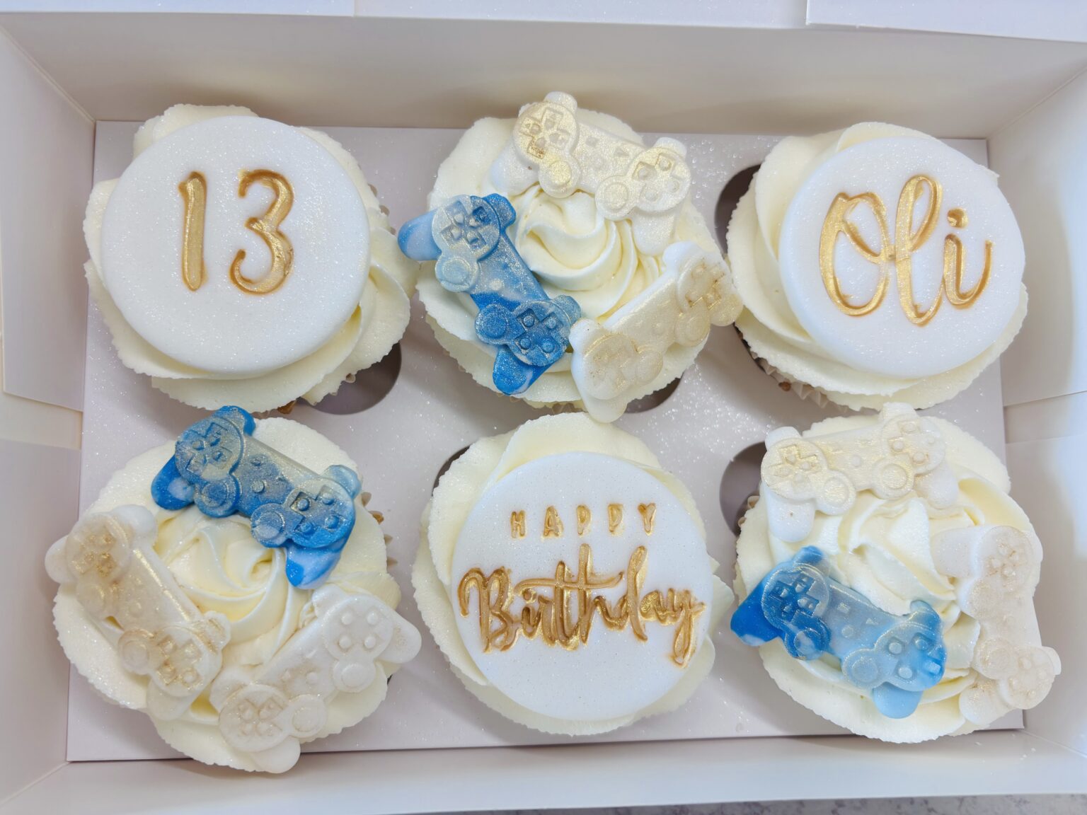 A box of six vanilla cupcakes topped with vanilla buttercream, decorated with edible PlayStation or Xbox controllers. Finished with fondant discs featuring “Happy Birthday,” the recipient’s age, and name. Please provide personalised name and/or age for the toppers at checkout, please note if this is not provided it will come with a standard “Happy Birthday” […]