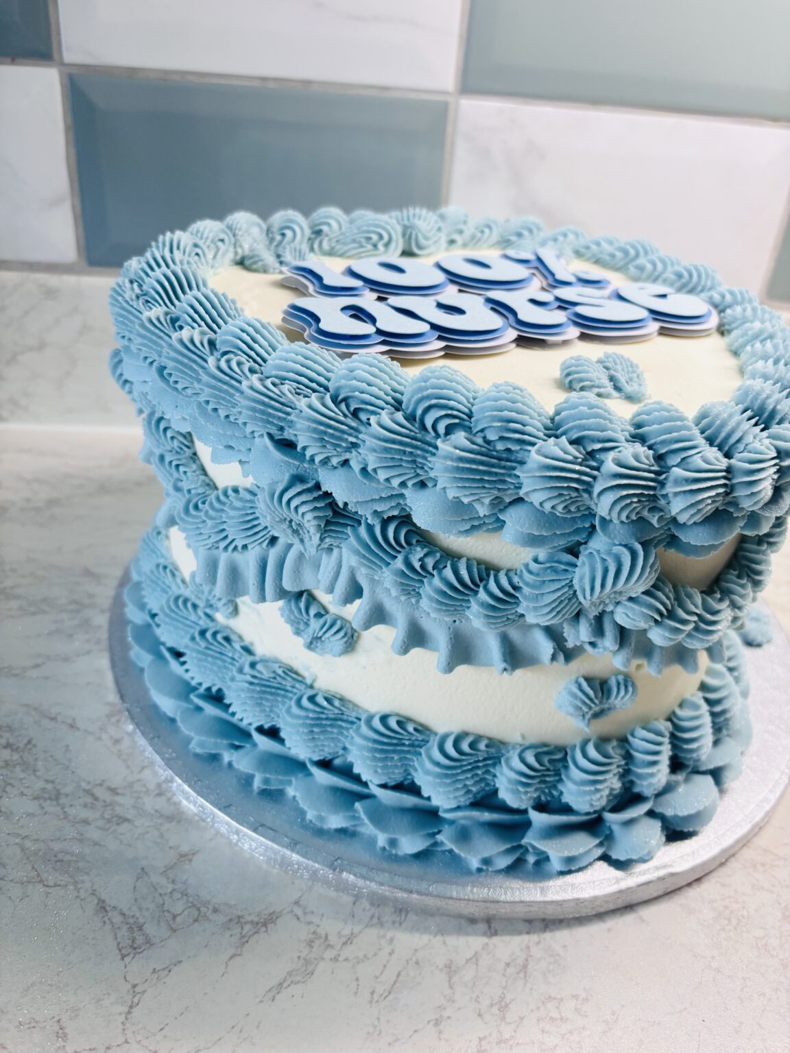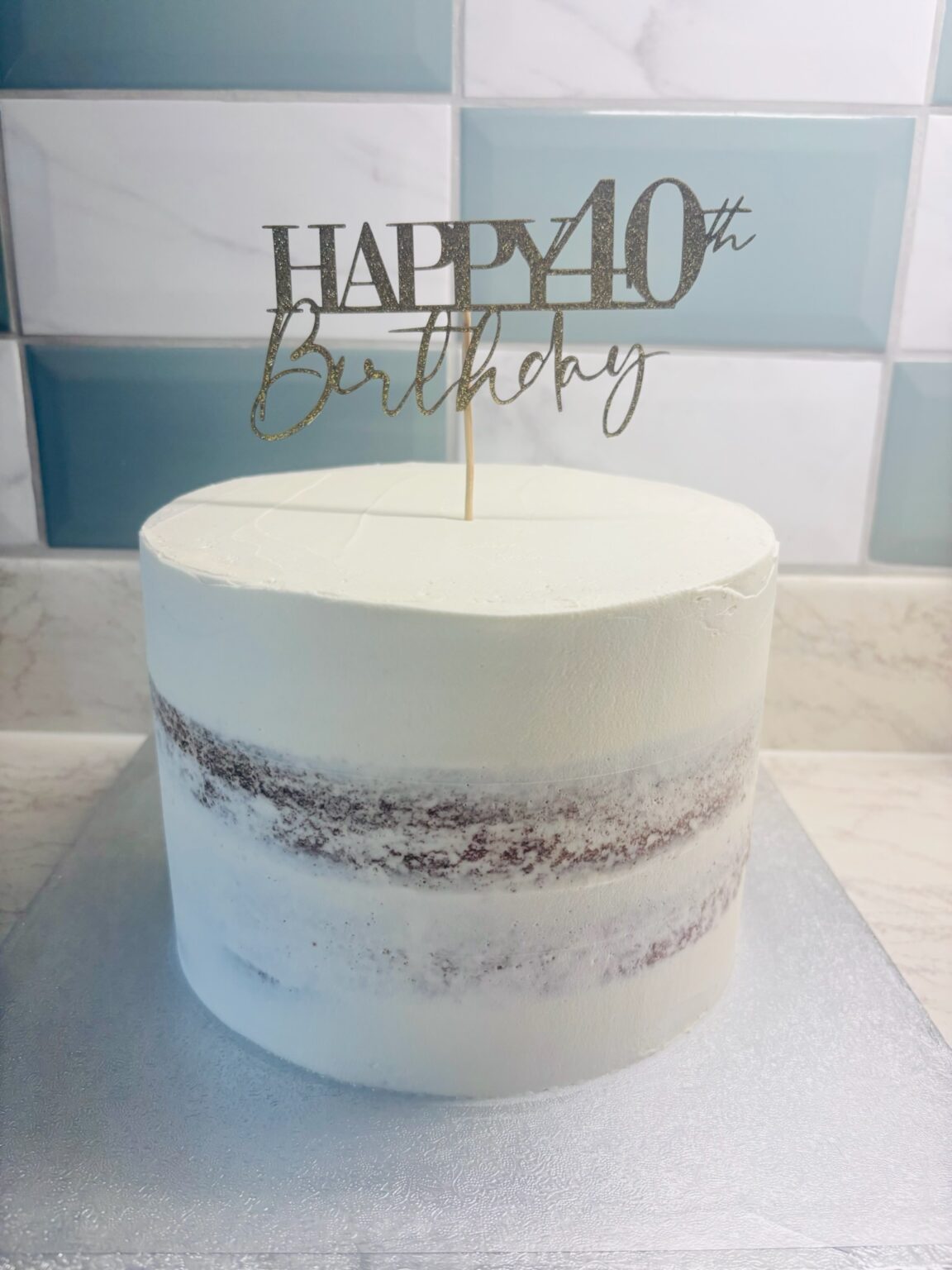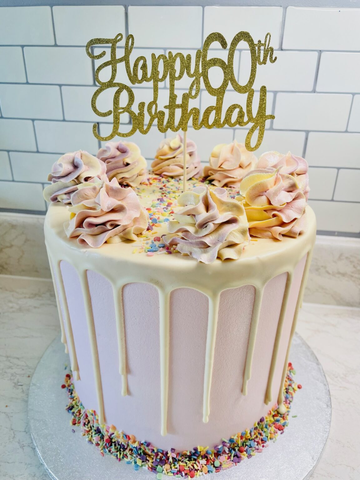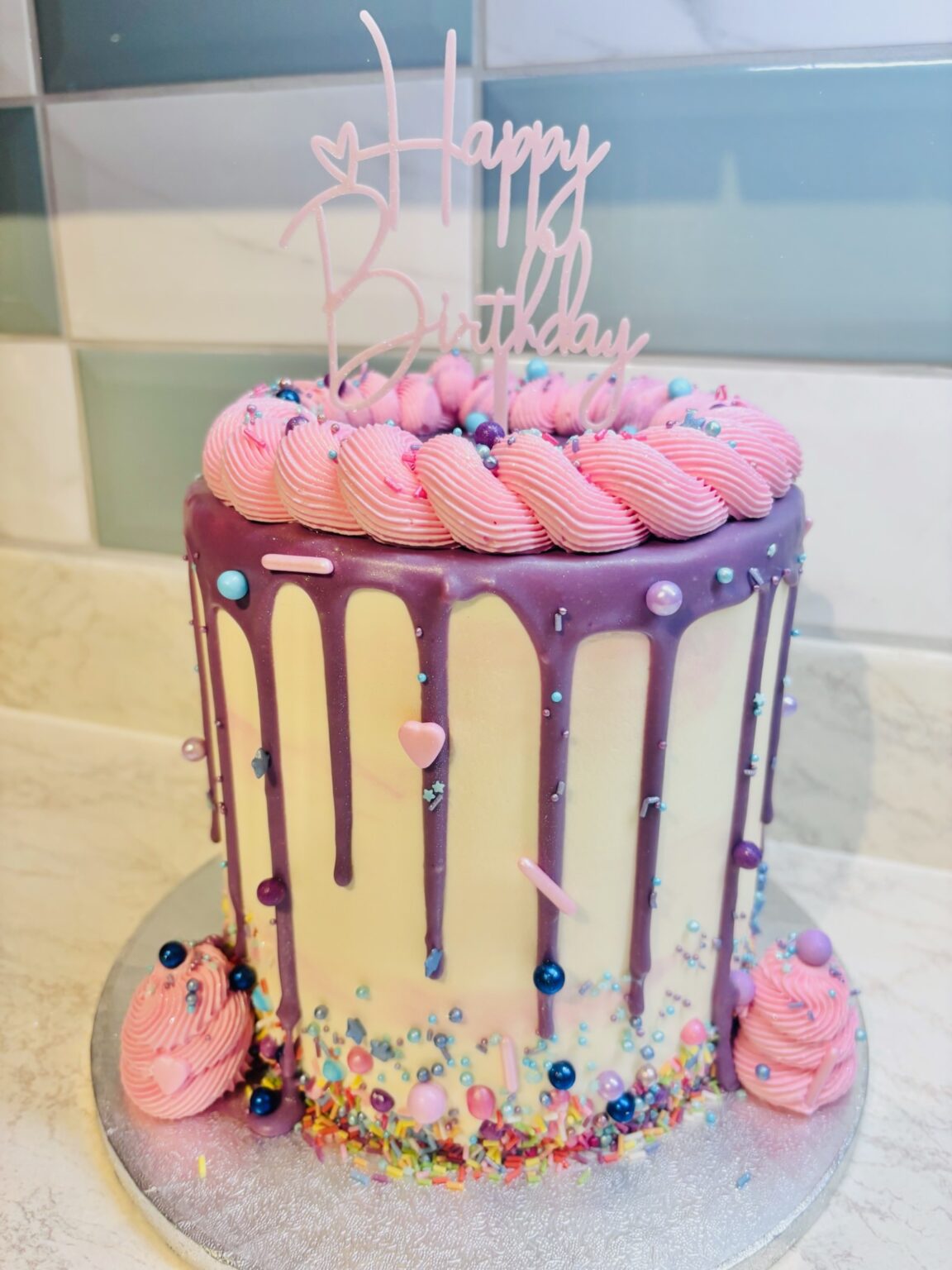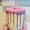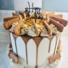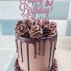 Flavour of your choice inside finished with vanilla buttercream outside and coloured white chocolate drips or milk chocolate drips. Topper can be just “Happy 50th” or “Happy 50th Birthday Jane”. Any extra requests/details please add a note on the order at checkout.