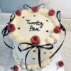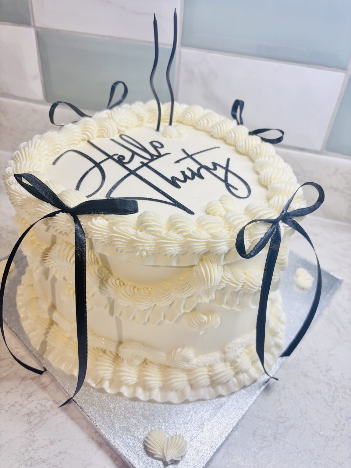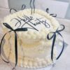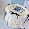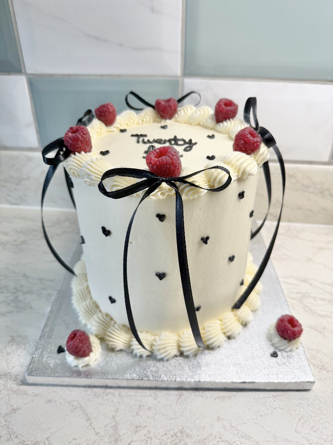 A refined and modern celebration cake finished in smooth white buttercream, delicately accented with tiny black heart details. Elegant black ribbon bows cascade down the sides, creating a gift-wrapped effect, while fresh raspberries crown the top and add a pop of color. Finished with subtle piping at the base and a minimalist message on top, […]