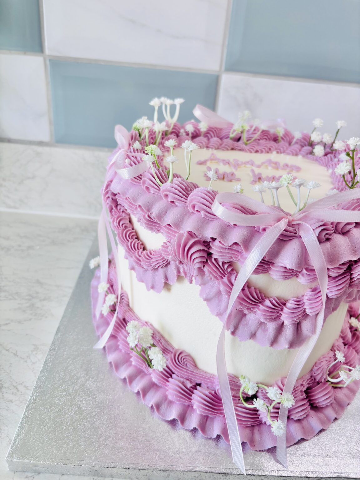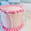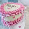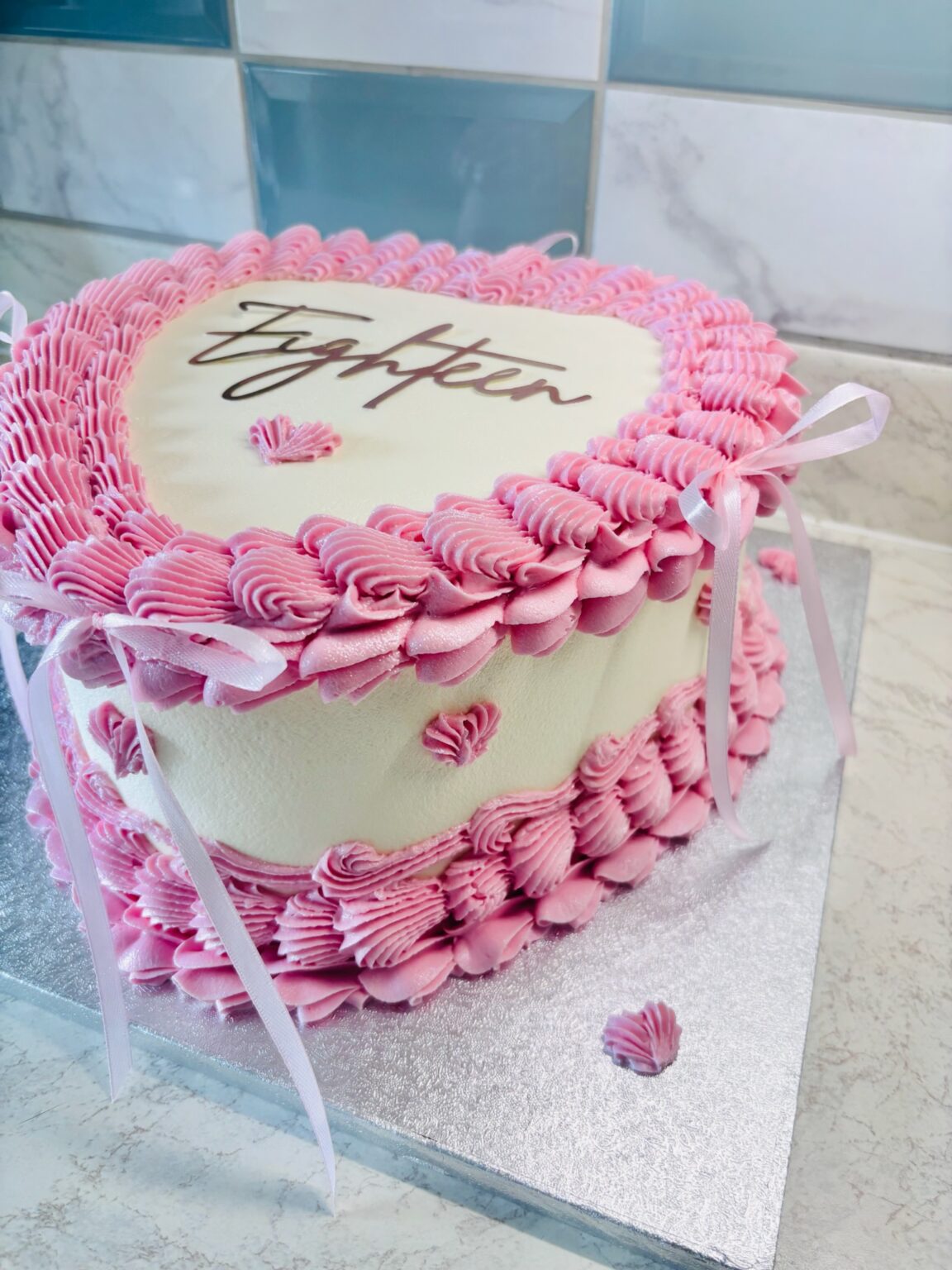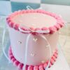 A charming pink buttercream cake decorated with tiny white hearts, elegant pink piped borders, and finished with delicate white ribbon bows. This sweet, vintage-style design makes the perfect centerpiece for any celebration. Choose your flavour and topper below. Please add any additional details in the notes section at checkout.