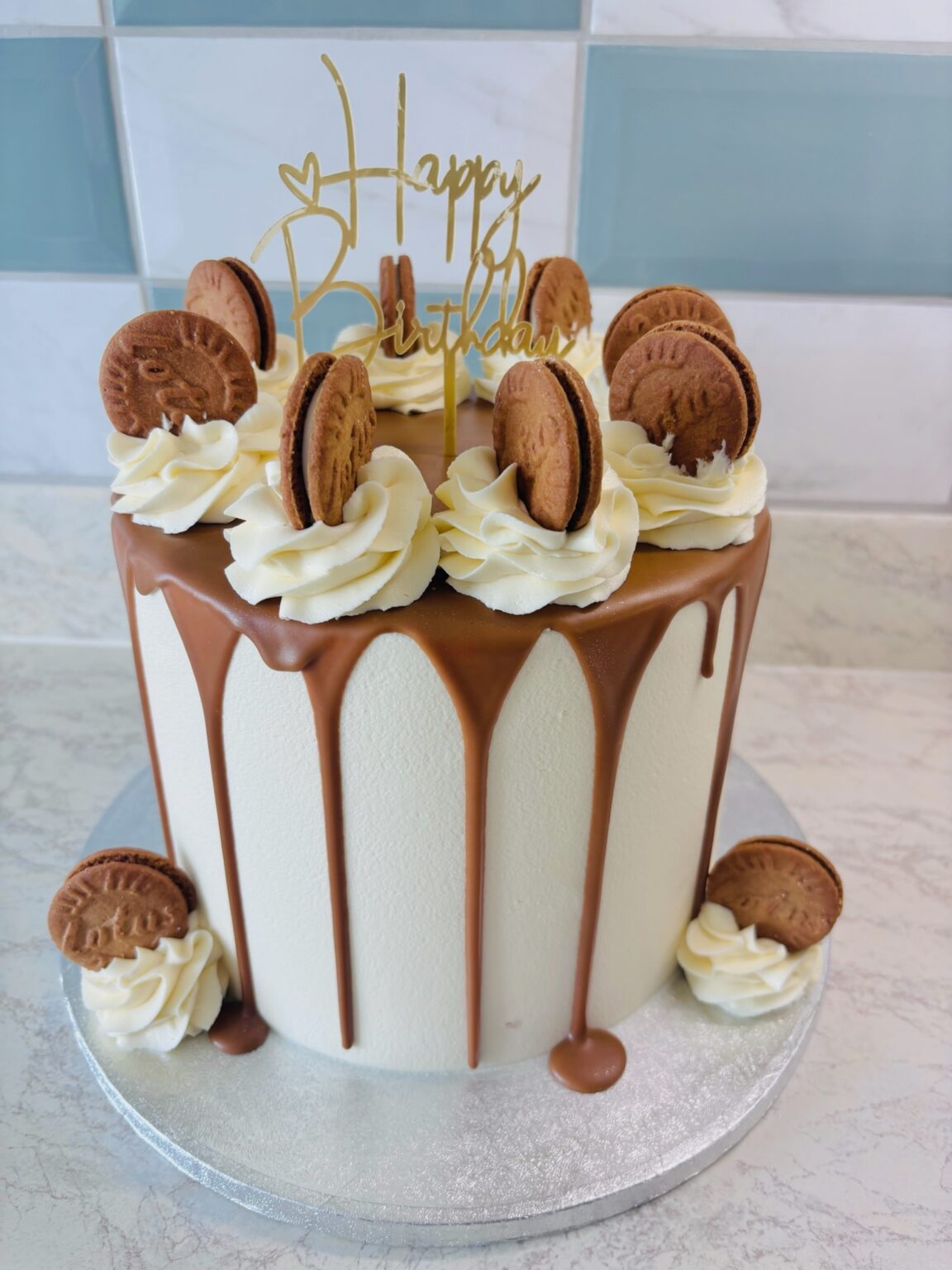 A soft vanilla sponge layered with smooth Biscoff buttercream and a generous swirl of Biscoff spread. The cake is finished with creamy vanilla buttercream on the outside, topped with Biscoff drips and decorated with Biscoff biscuits. Your topper can be personalised — for example, “Happy 50th” or “Happy 50th Birthday Jane.” Choose your preferred option […]