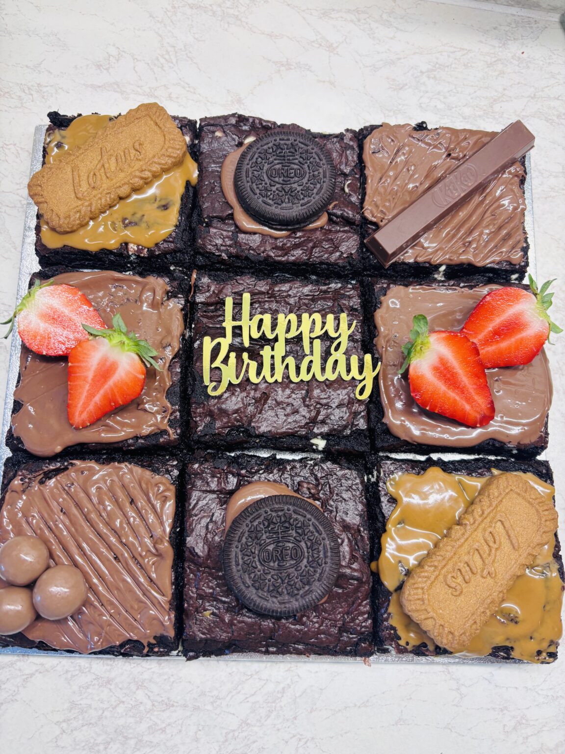Nine indulgent, generously sized brownies baked to gooey perfection, lavishly topped with Biscoff, Oreo, KitKat, Maltesers and fresh strawberries. Finished with a Happy Birthday topper for a stunning gift, or available without the topper for the ultimate sweet treat to enjoy anytime.