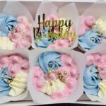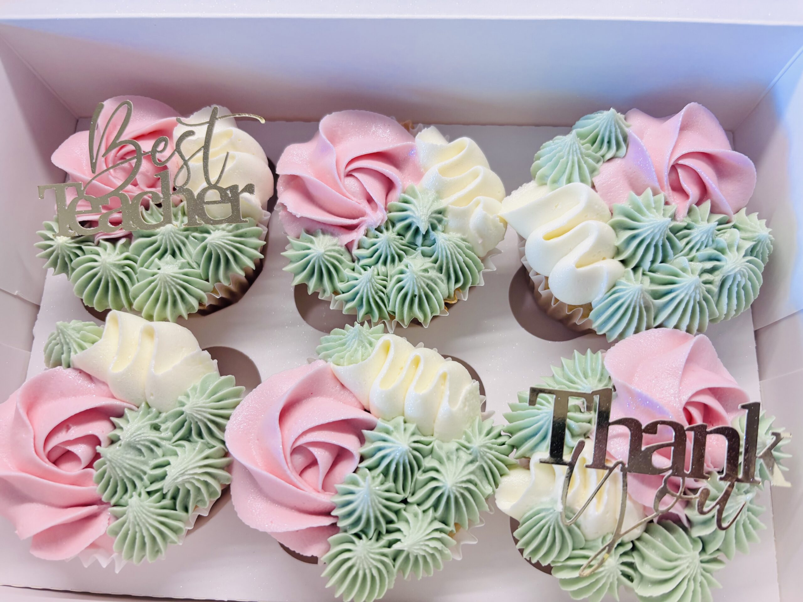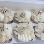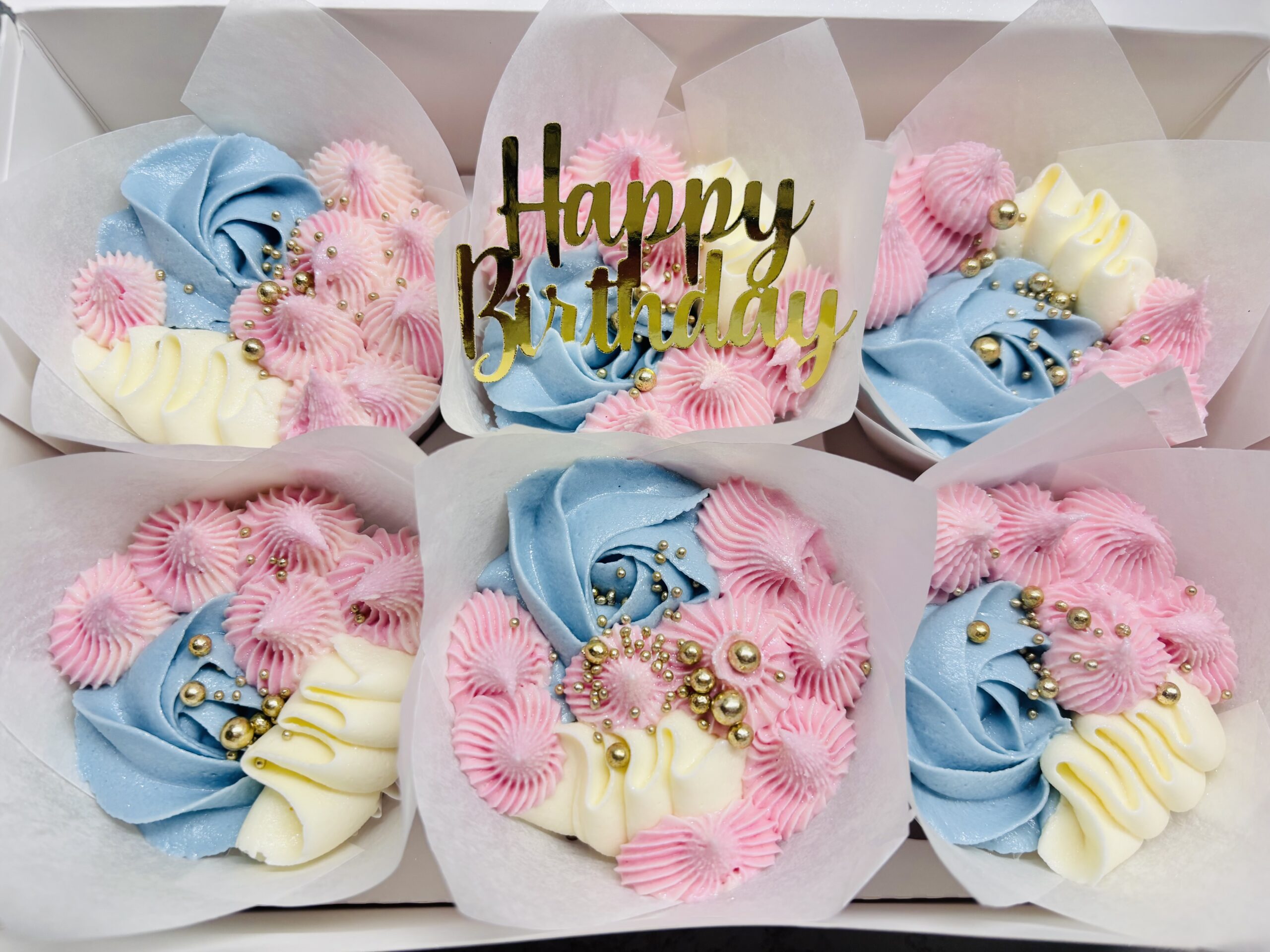 A delightful box of six vanilla cupcakes, each beautifully decorated with three different piping styles for a fun and elegant variety. Perfect for sharing, gifting, or treating yourself to a sweet indulgence.