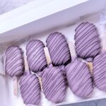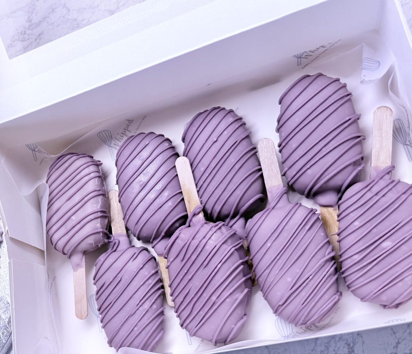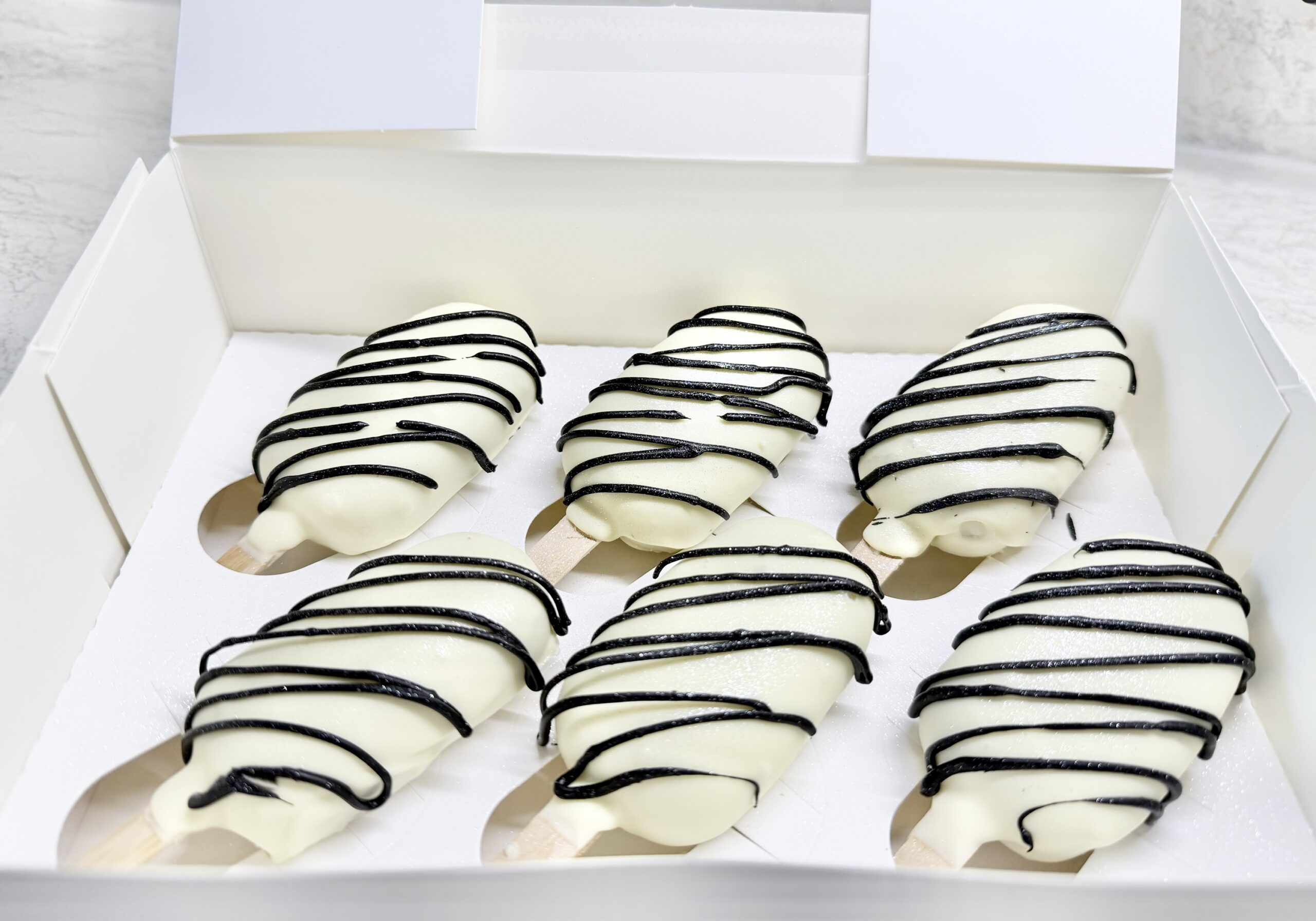 Each cakesicle is then coated in a luscious layer of white or milk chocolate, finished with chocolate drizzles.