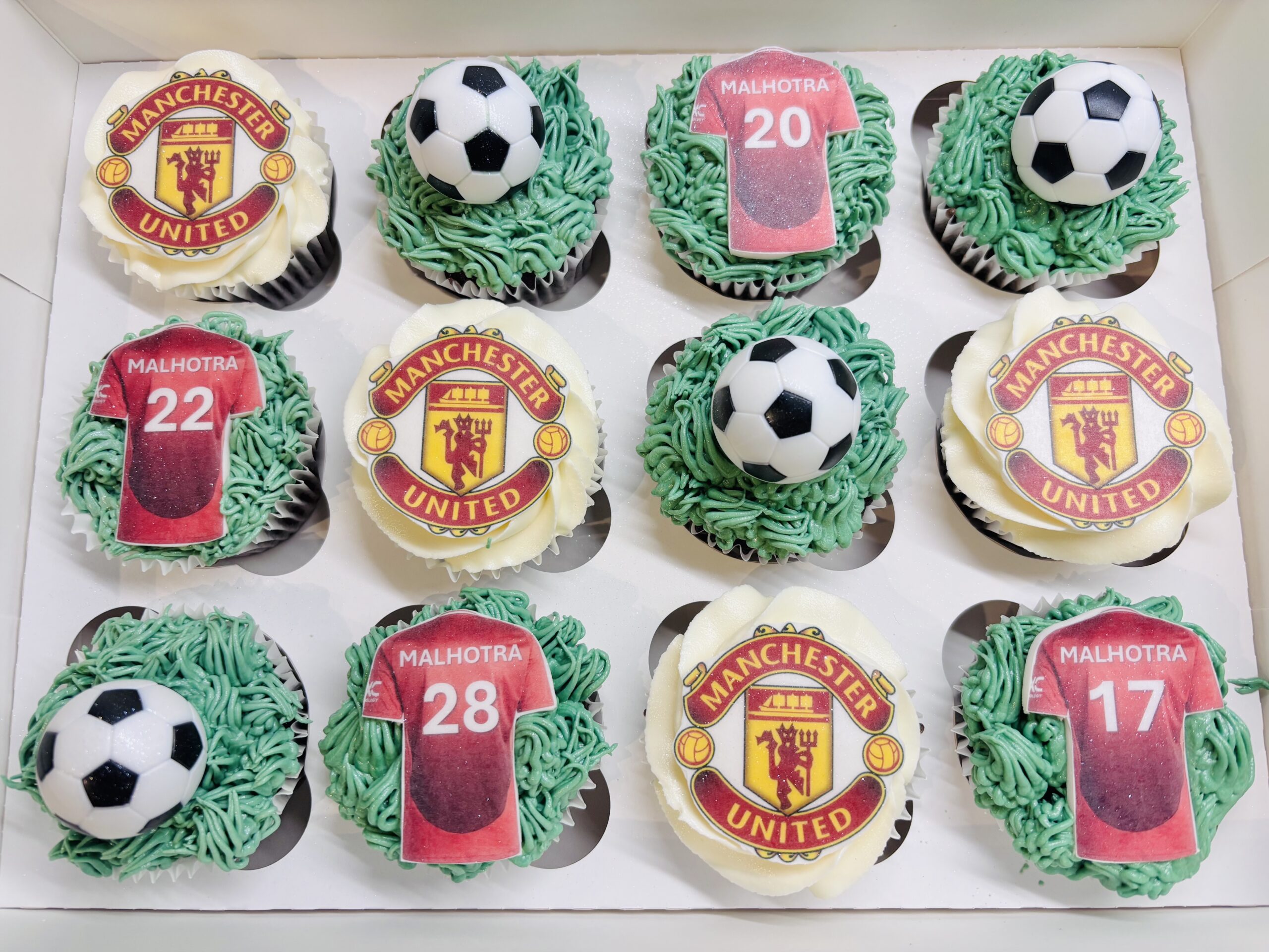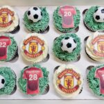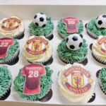 A box of vanilla football-themed cupcakes decorated in green buttercream to resemble grass, each topped with your favourite teams logo and shirts (edible), and non edible mini footballs.