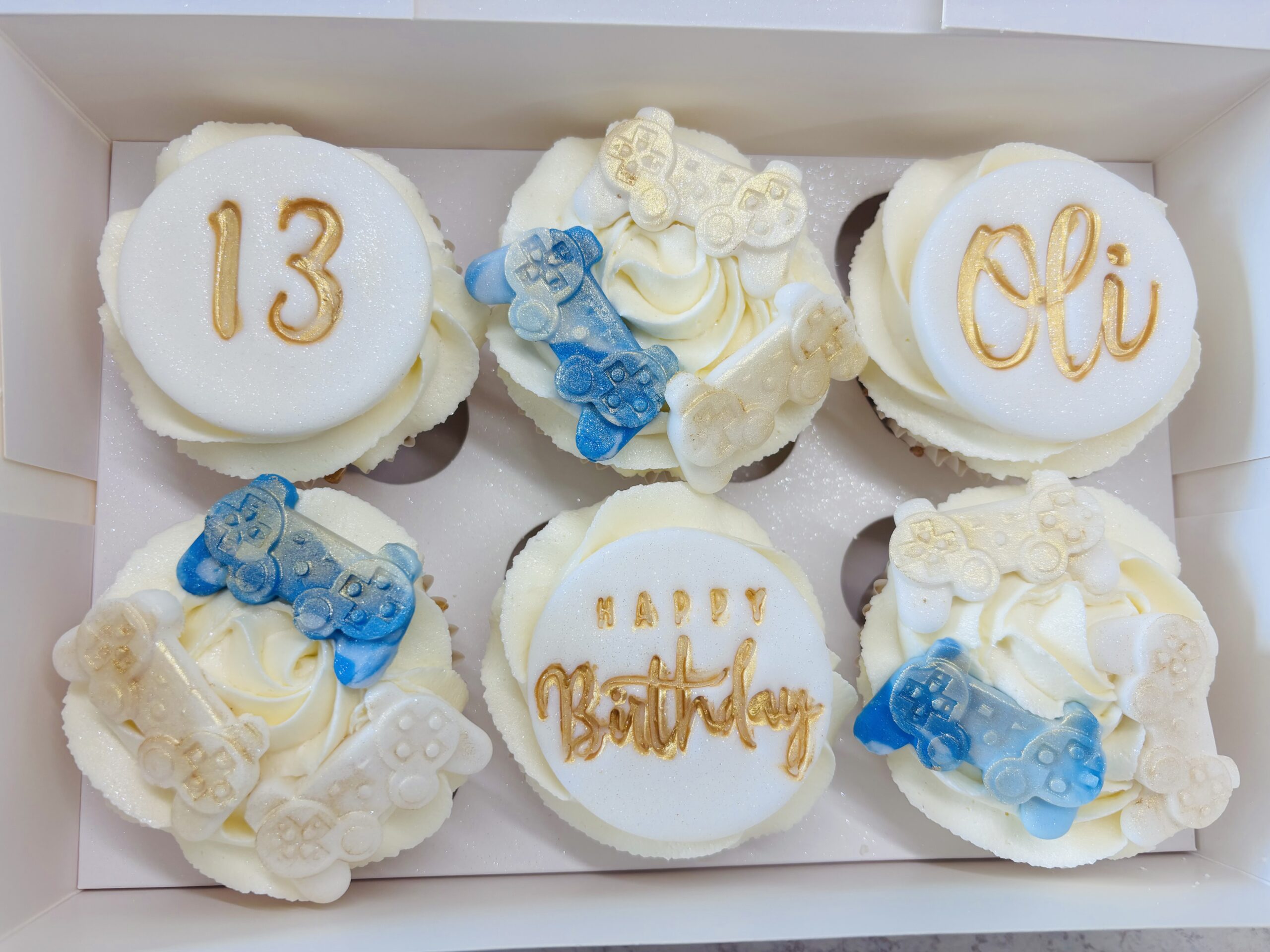 A box of six vanilla cupcakes topped with vanilla buttercream, decorated with edible PlayStation or Xbox controllers.