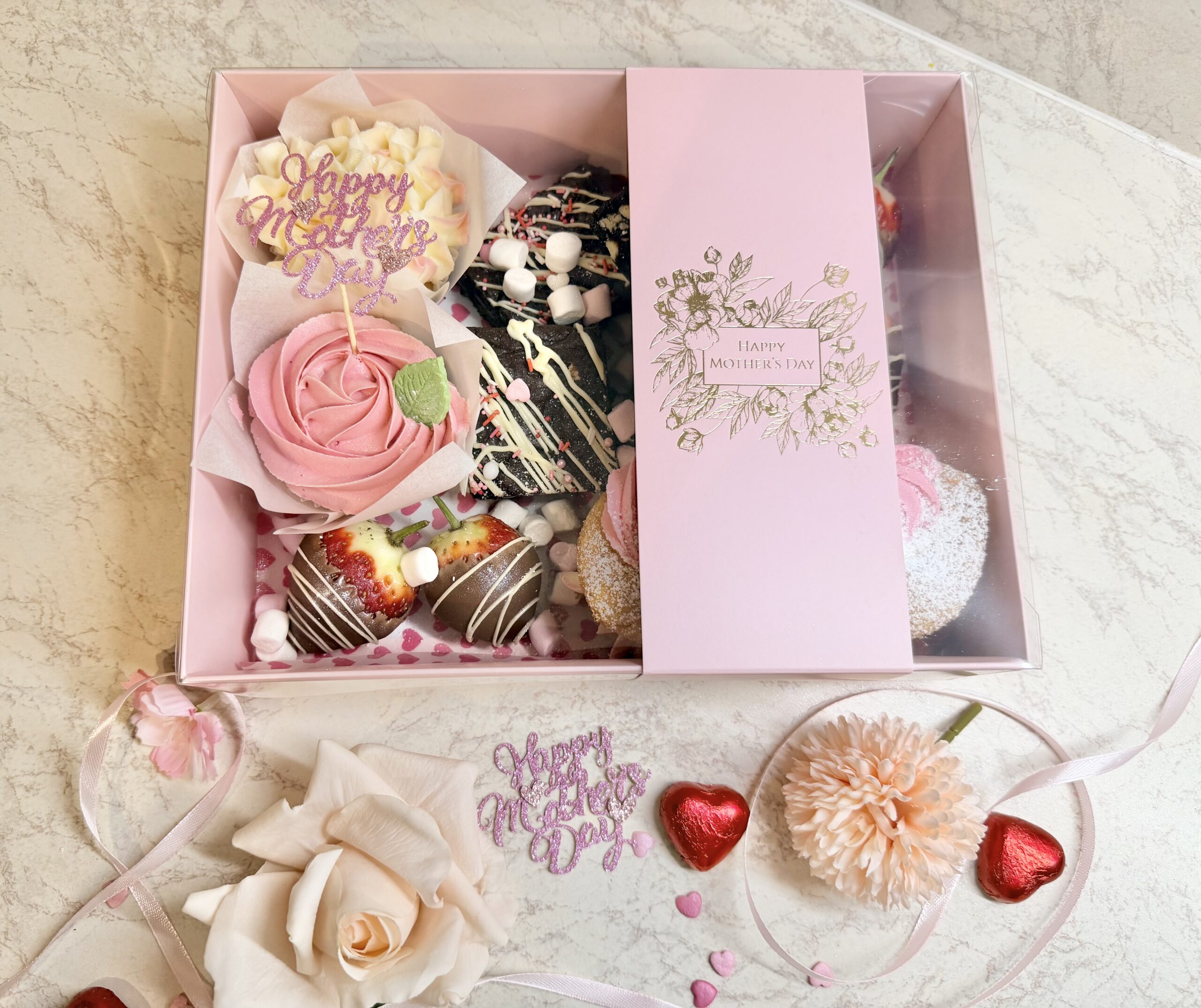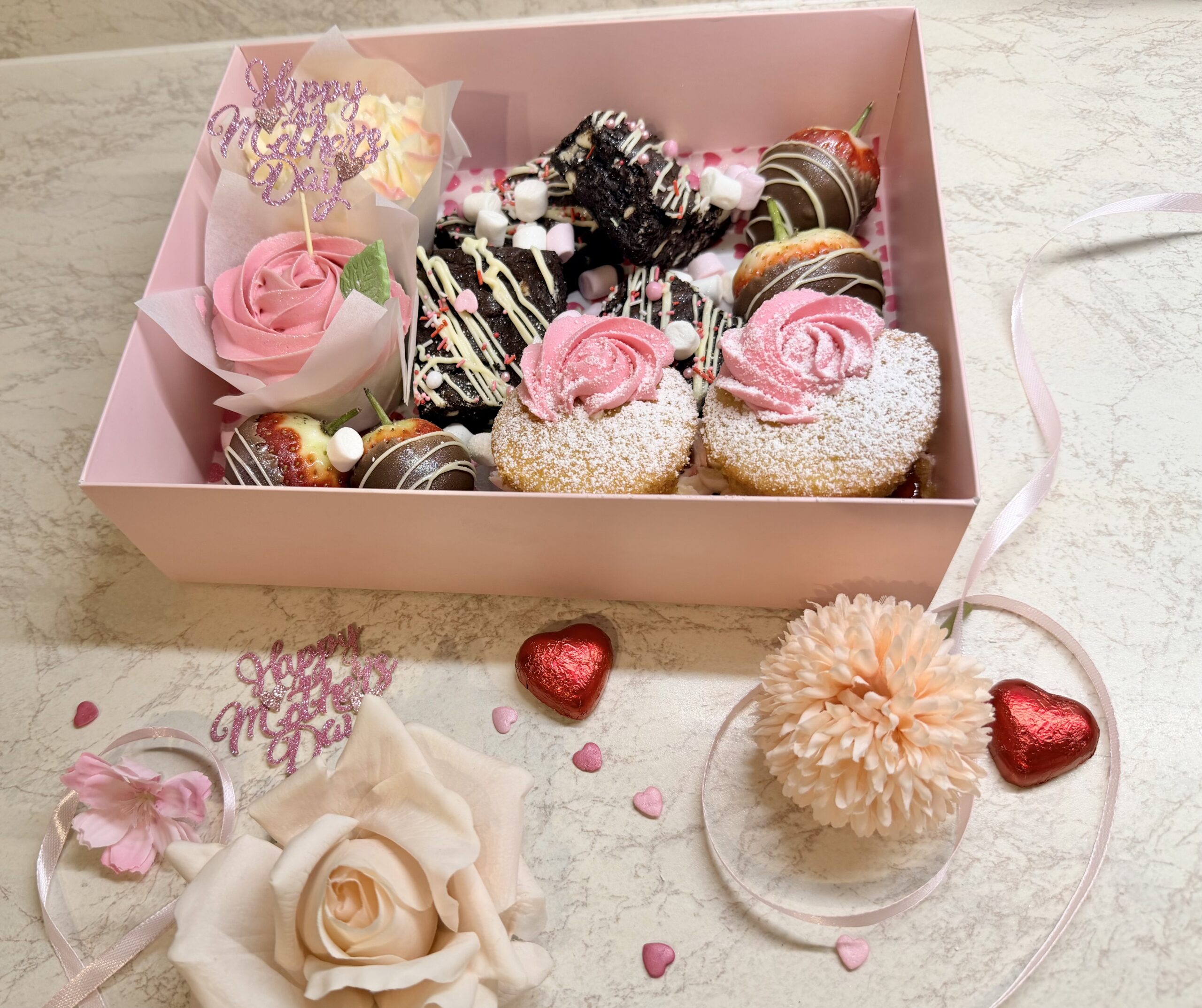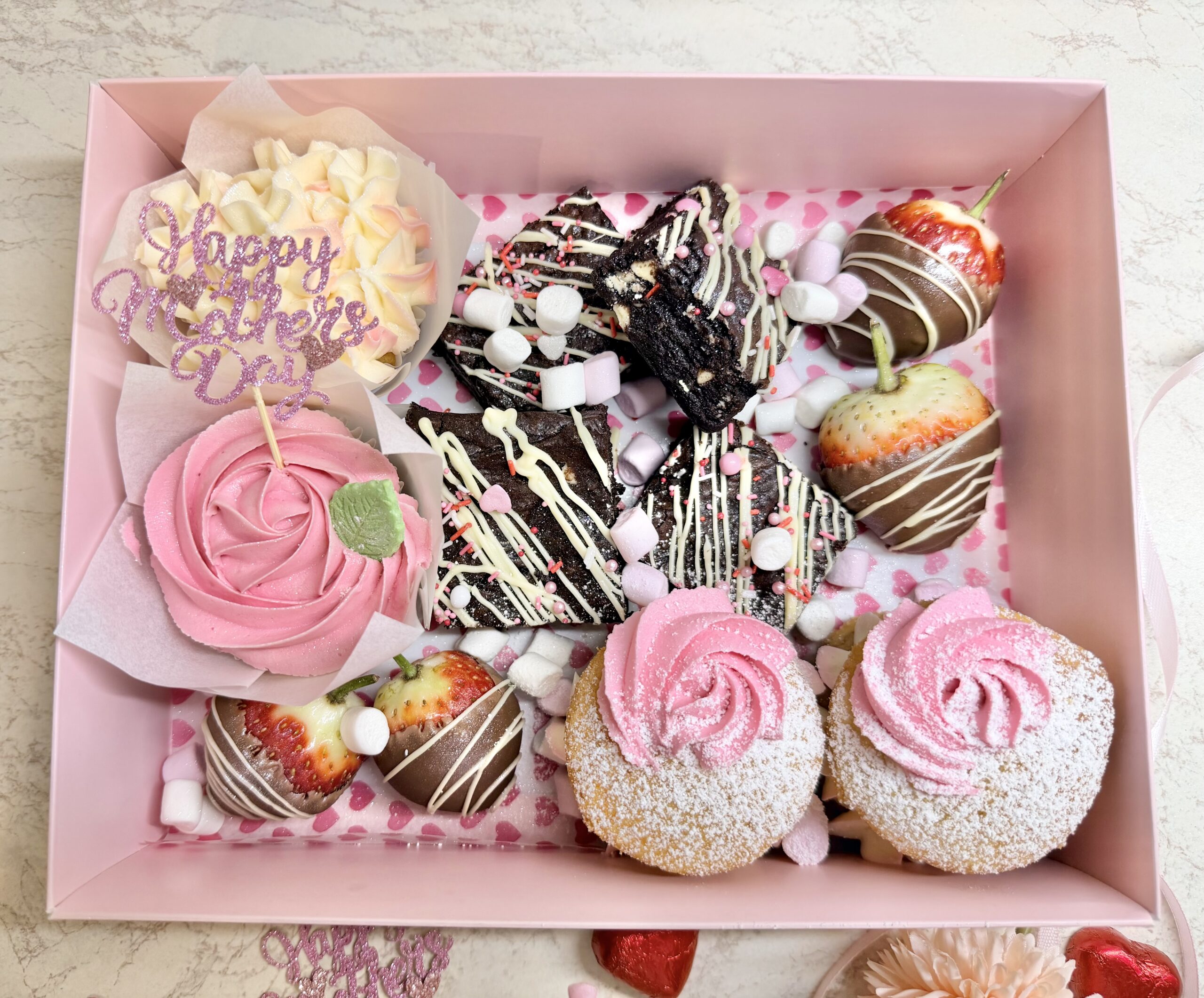 Featuring 2 delicious cupcakes, 4 gooey brownies, 2 light mini Victoria sponges, and 4 chocolate-dipped strawberries, it’s made for sharing sweet moments and celebrating her—one indulgent bite at a time.