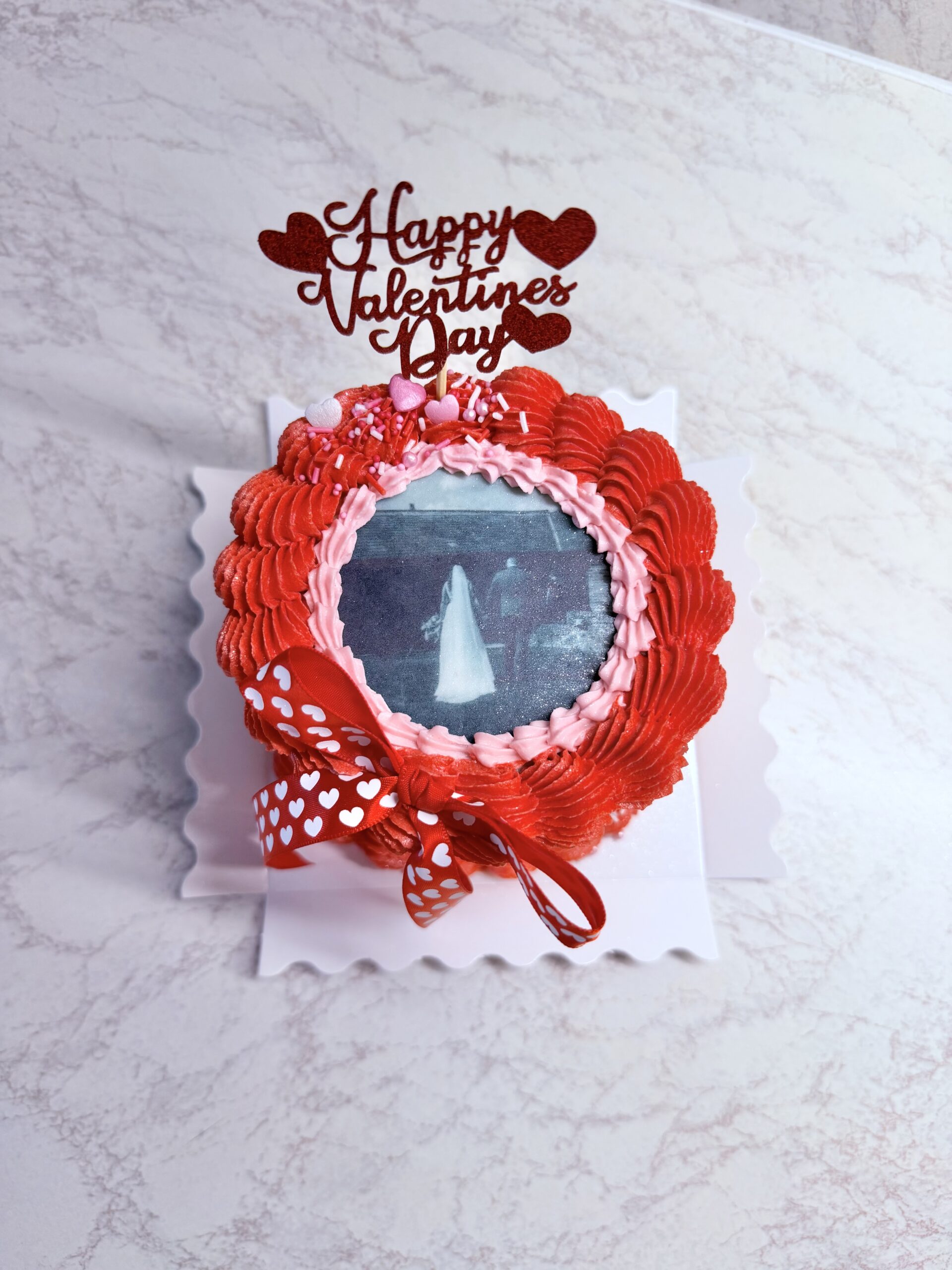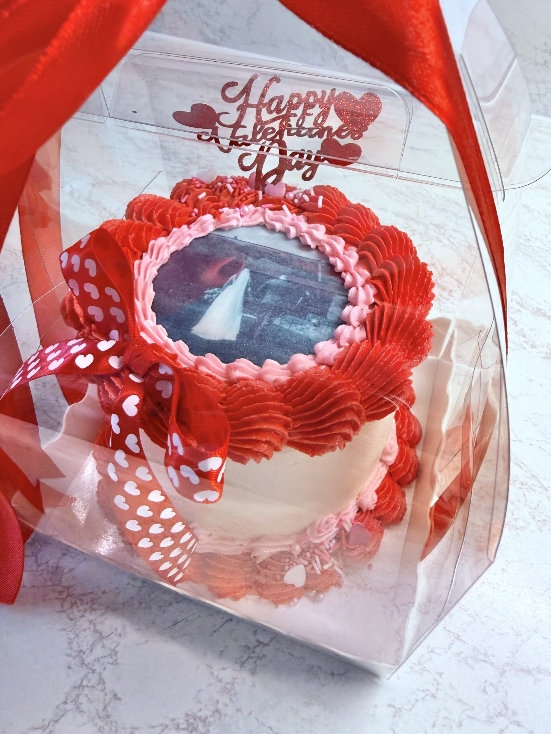 Beautifully decorated with red and pink piped details, this cake can be customized with your photo placed at the center or left classic without an image.