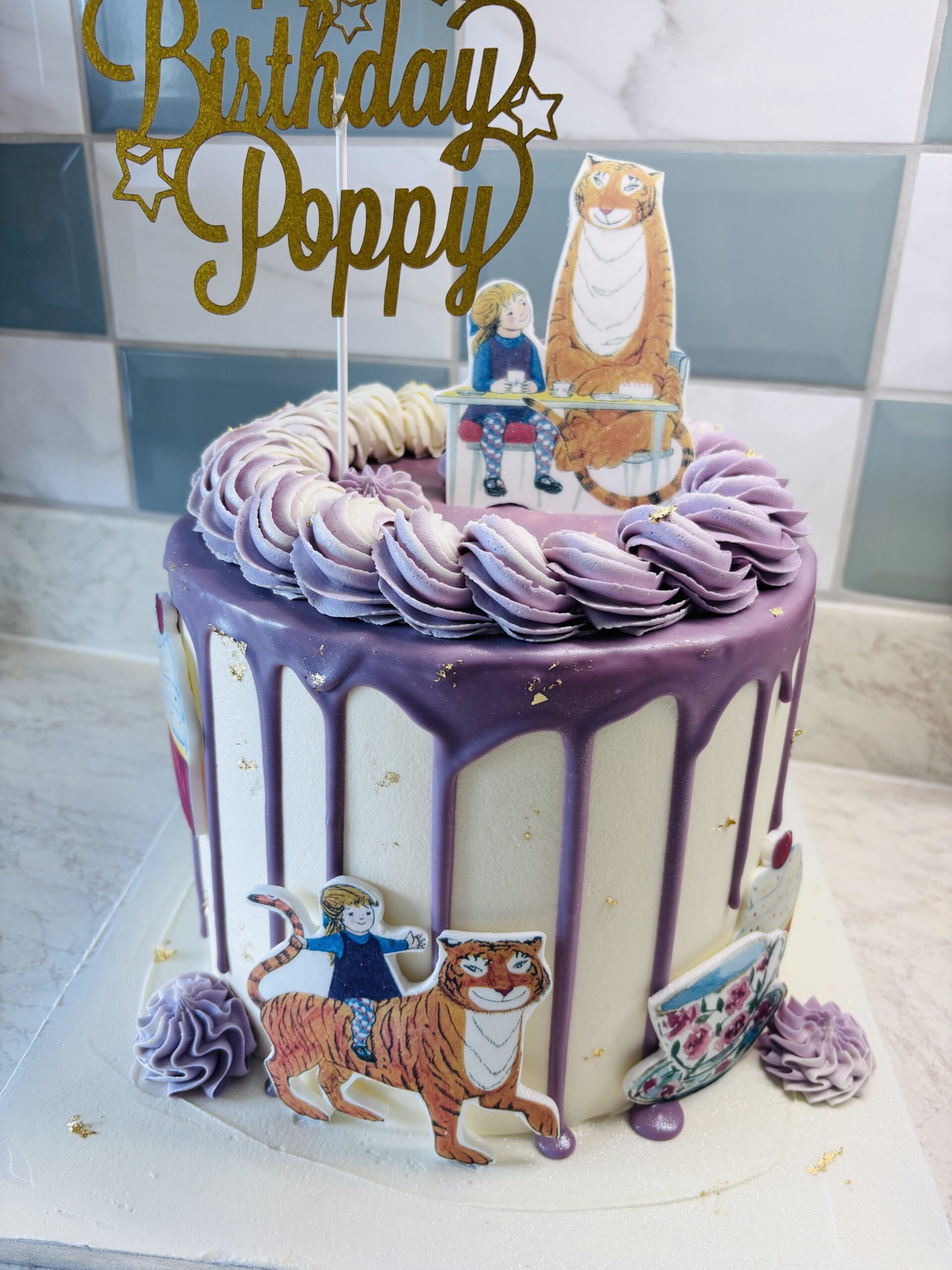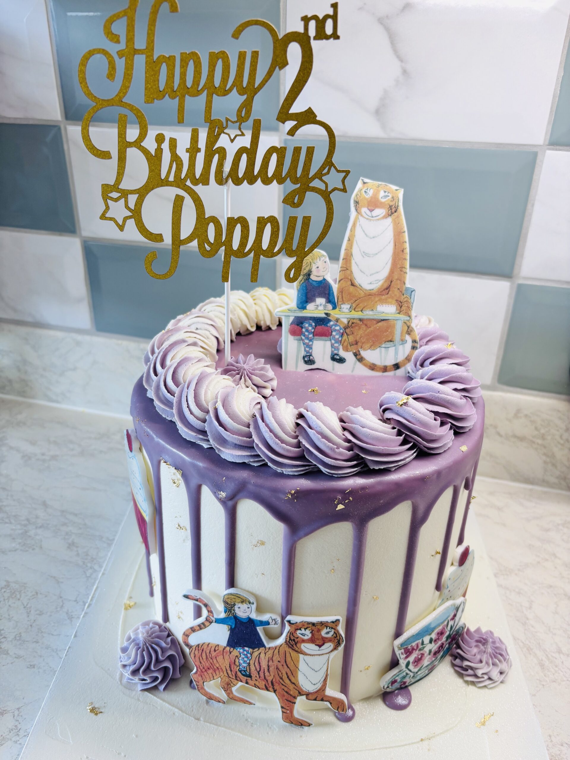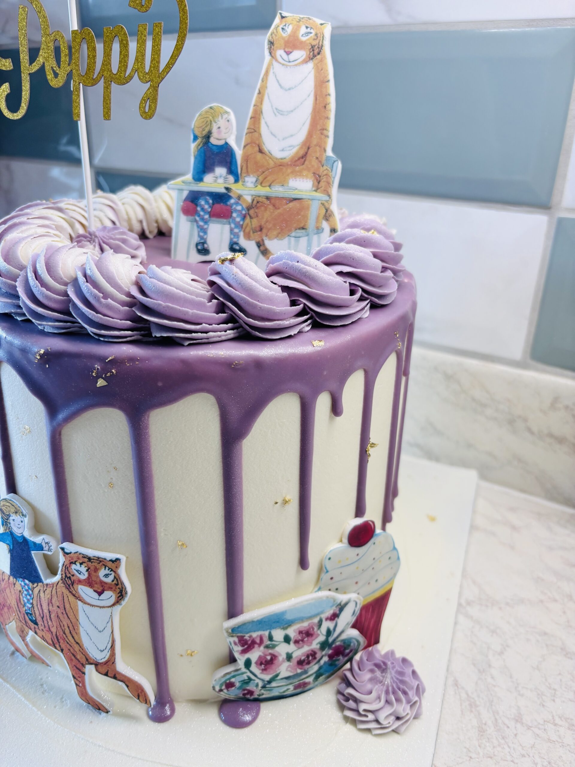 Bring a beloved story to life with our “The Tiger Who Came to Tea” Cake. Featuring playful purple drip detailing and charming tiger-inspired edbile decoration, this cake is perfect for little ones who love this classic tale.