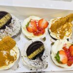 A box of six vanilla cupcakes topped with smooth vanilla buttercream and a variety of toppings: two Oreo, two Biscoff, and two fresh strawberry cupcakes.