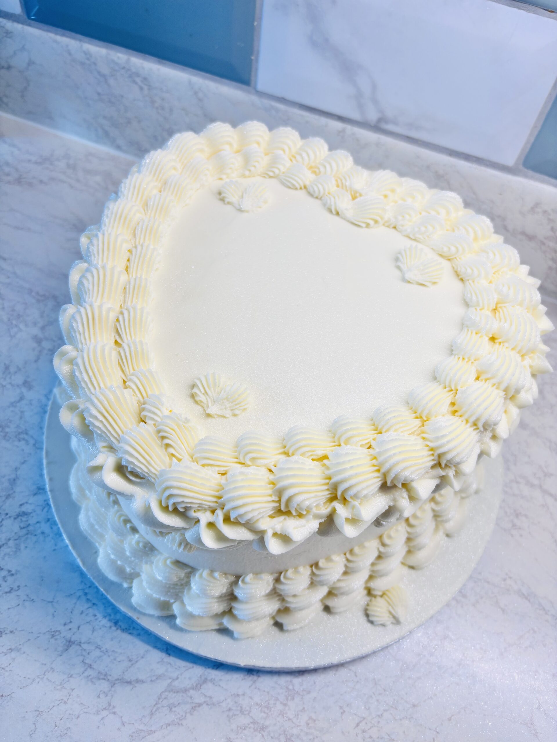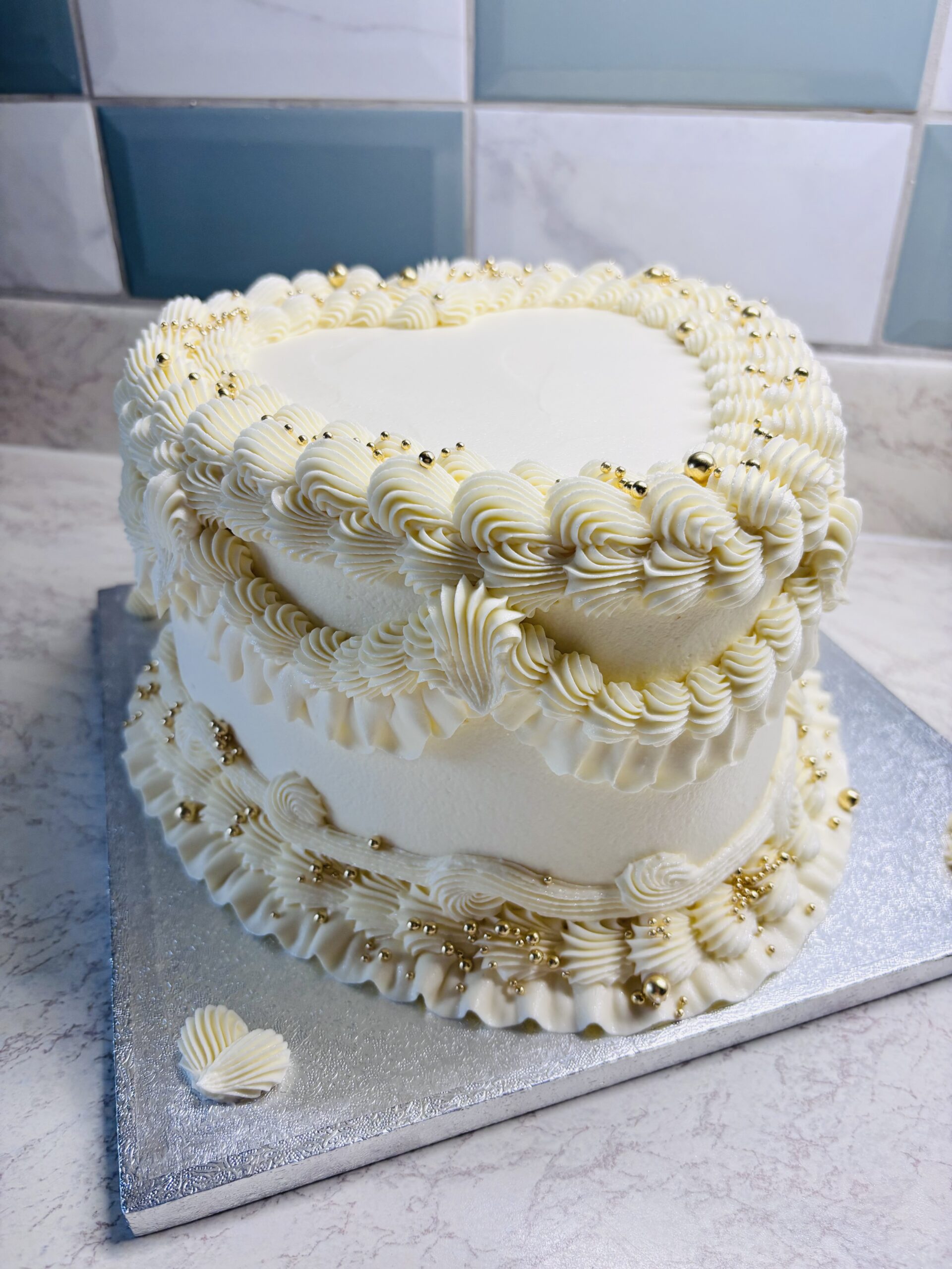 A beautifully nostalgic design inspired by classic bakery styles. This heart-shaped cake features smooth vanilla buttercream, delicate piped borders, and charming decorative details that give it a timeless, romantic look. Perfect for birthdays, anniversaries, or any occasion that calls for something sweet, stylish, and sentimental.